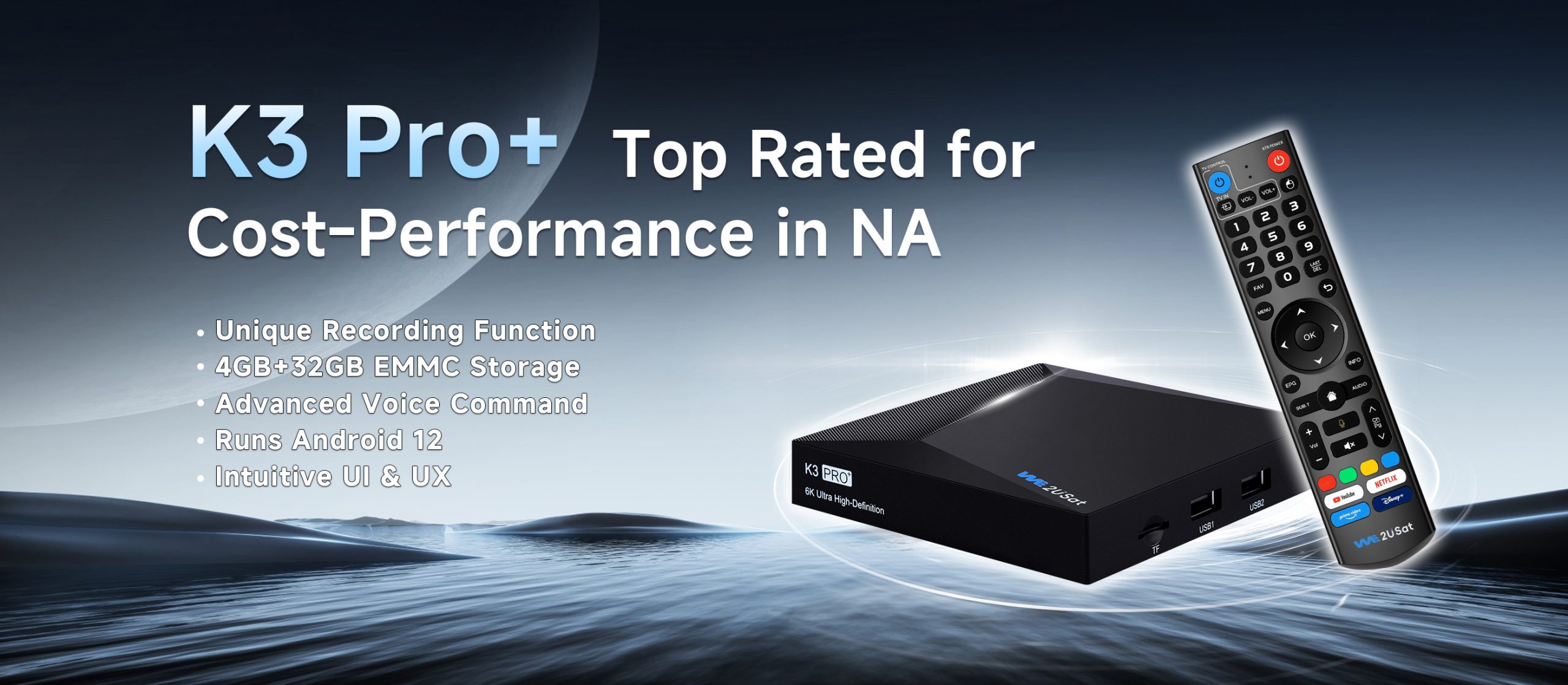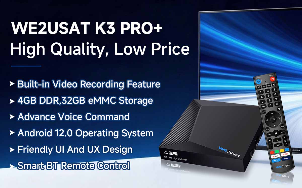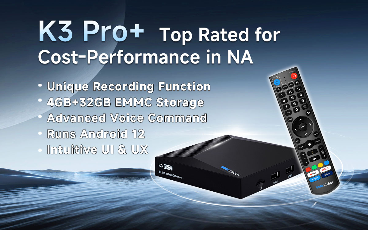 WE2USAT K3 Pro+ Android TV Box, upgraded Android 12, brings you a safer and superior 6K UHD picture quality, enabling a smooth and clear streaming experience.