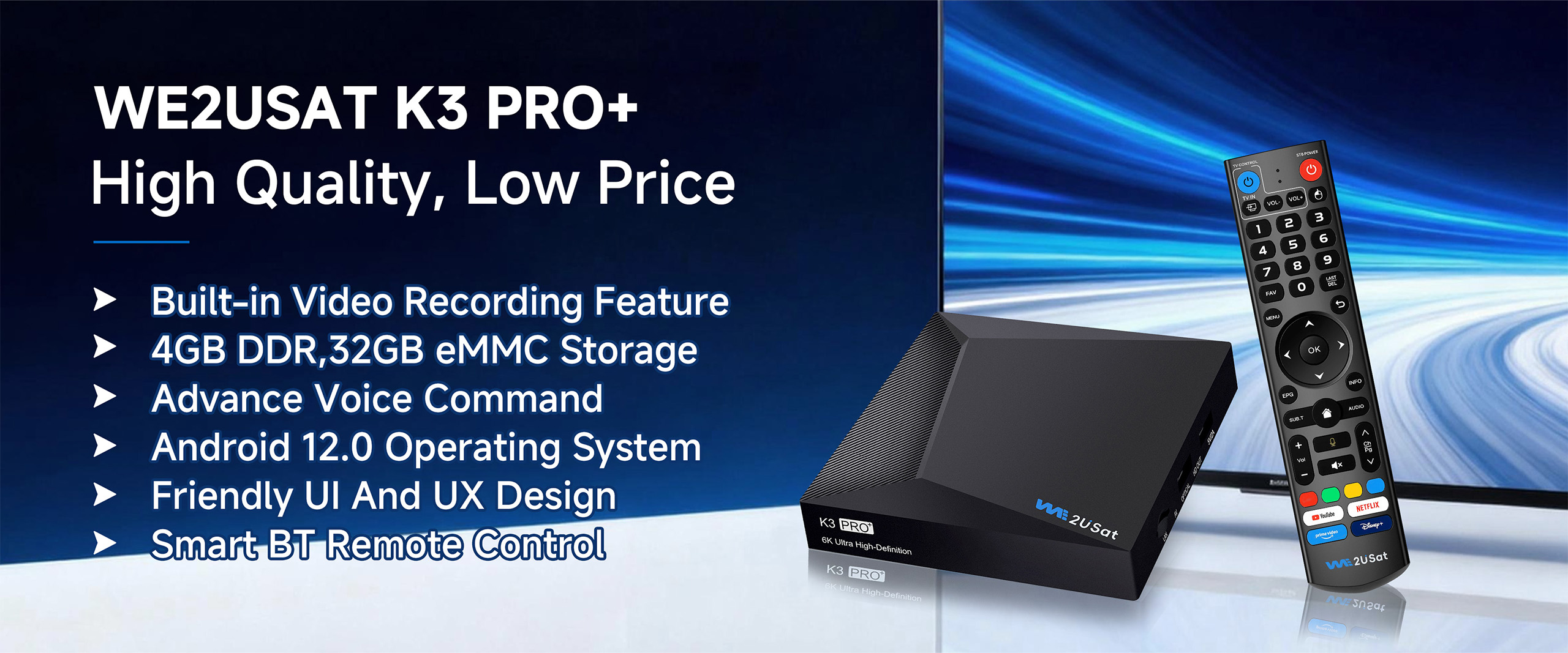 Experience stunning 6K Ultra HD quality with the WE2USAT K3 Pro Android TV Box. Enjoy premium 6K streaming with HDR support for the ultimate entertainment experience.