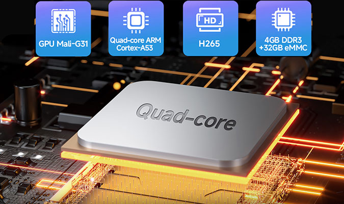 Equipped with a quad-core ARM Cortex-A53 processor and an independent Mali-G31 GPU, it delivers robust performance support. The combination of 4GB RAM and 32GB eMMC large-capacity storage ensures smooth operation and swift responsiveness.Whether for immersive viewing or high-speed gaming, enjoy uninterrupted premium streaming experiences, free from delays or lags.