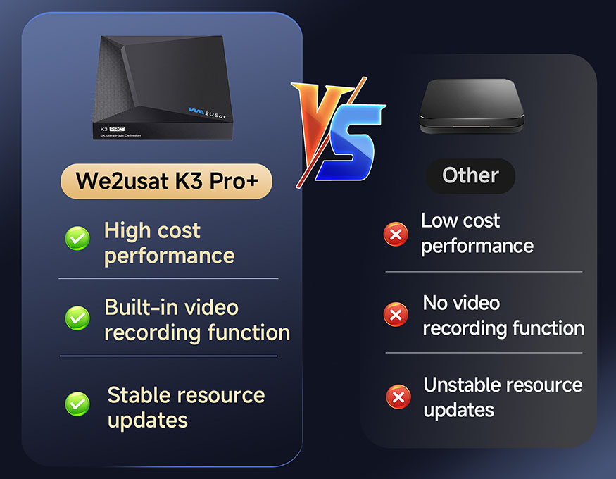 The We2usat K3 Pro+ is a flagship-level IPTV box that combines high cost-effectiveness with ultimate entertainment experience. Quad-core processor, 4GB RAM, 32GB ROM storage, its powerful performance ensures smooth and seamless system operation. Advanced Android 12.0 system, it offers a more user-friendly interface and an enhanced viewing experience. Built-in video recording function, you can capture your favorite shows anytime and never miss another highlight moment. Dual-band Wi-Fi and Wi-Fi 6 technology, 1000Mbps Ethernet connection, it delivers lightning-fast streaming speeds.The upgraded Bluetooth voice remote allows you to easily search for content and control playback with just a voice command.
