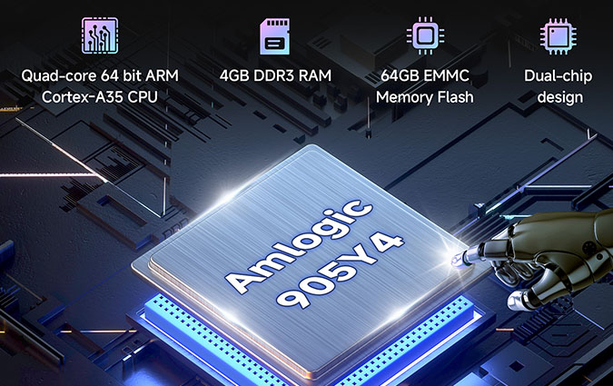 The P6 Mini the unique Amlogic 905Y4 dual-chip design, paired with 4GB RAM, 64GB storage, a quad-core processor, and the dedicated Mali-G31MP2 GPU.This Powerful hardware configuration effortlessly drives exceptionally smooth 8K UHD streaming for a seamless, lag-free viewing experience.
