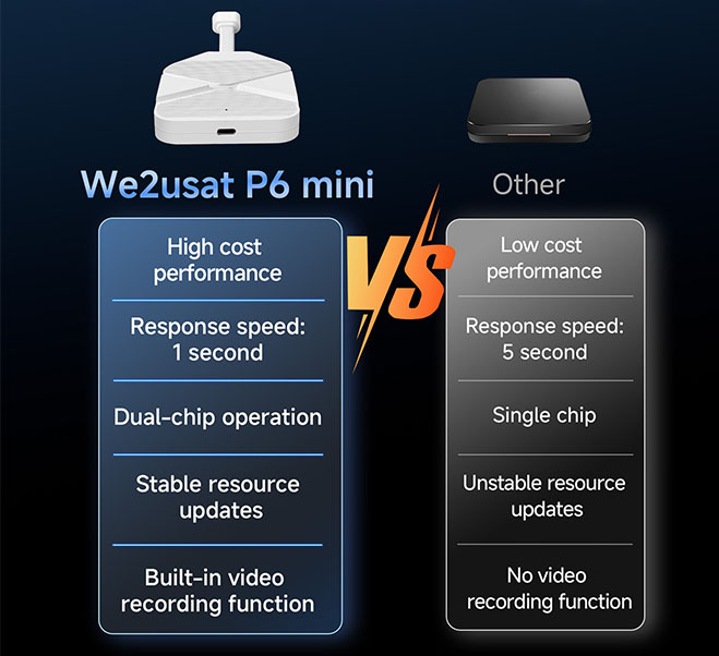 We2usat P6 Mini, Compact Size, High Performance.It features an Amlogic 905Y4 dual chip with quad-core processor,4GB of RAM and 64GB of storage, runs on Android 14.0, and is equipped with a Mali-G31MP2 GPU for smooth 8K video playback. The built-in video recording function ensures you never miss a moment. With dual-band Wi-Fi 6 and upgraded Bluetooth voice remote, enjoy fast connectivity and effortless control.