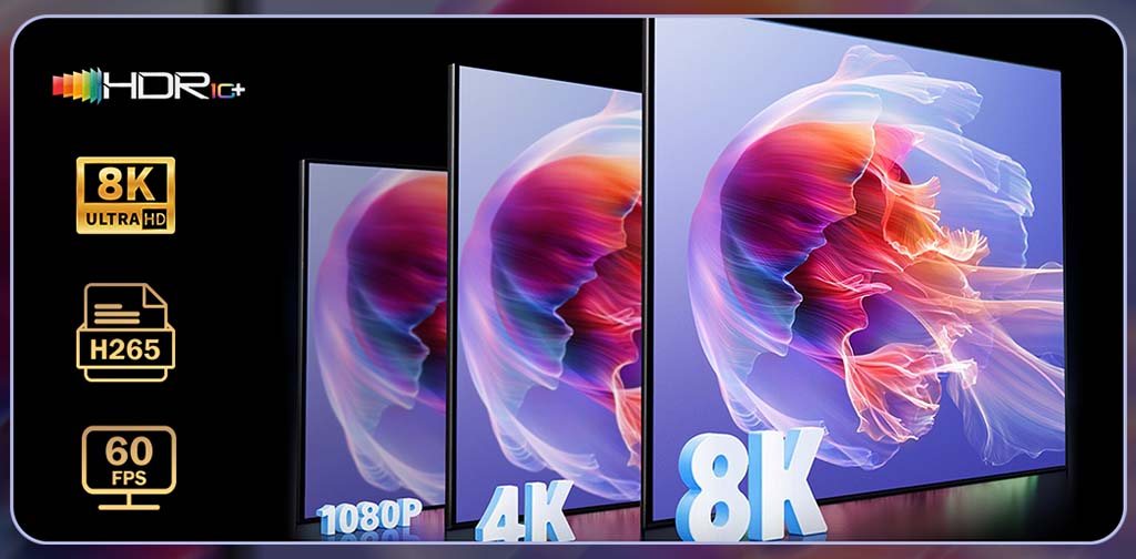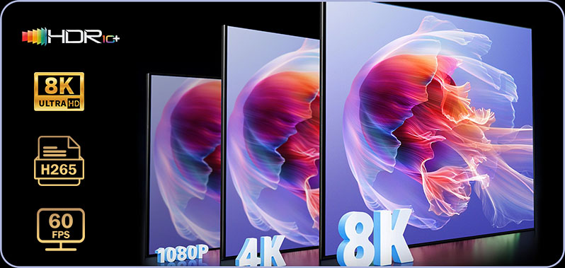 Compared to H.264, the H.265 technology holds a generational advantage in decoding efficiency. It effortlessly handles 8K@60FPS HDR high-definition video, significantly reducing buffering to deliver an ultra smooth,nearly stutter free playback. Finer image details bring you a truly immersive viewing experience